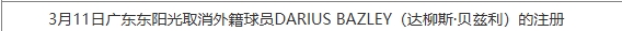 03月11日讯 CBA官网更新外籍球员注册名单,广东取消贝兹利的注册,重新注册吉伦沃特。