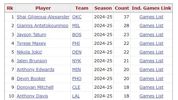 还有谁!赛季至今亚历山大20+到50+场次都是联盟第一
