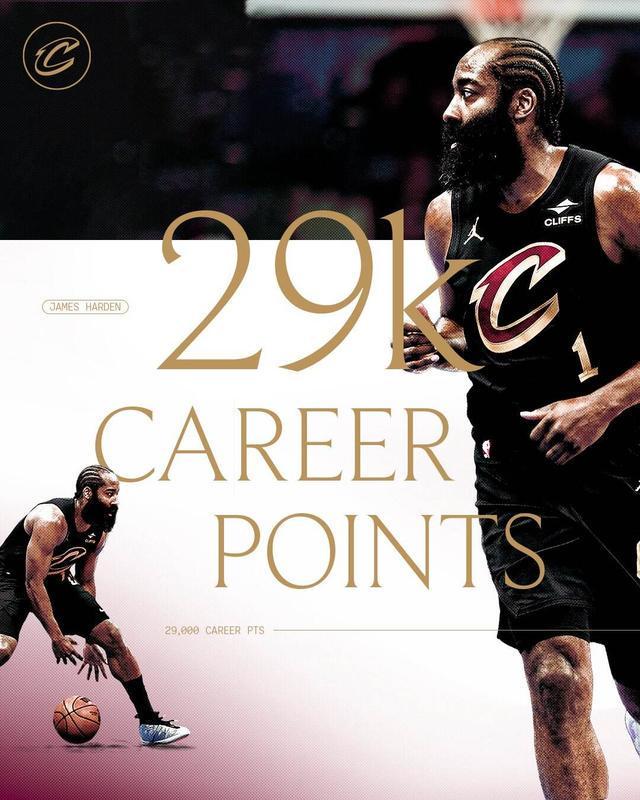 据统计,哈登的个人生涯总得分正式突破29000分里程碑(历史第九人),他也成为了NBA历史上第二位至少拿下29000分+8000助攻的球员。(NBA官网)