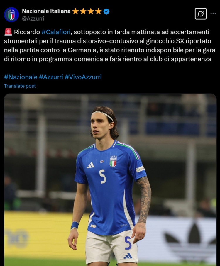 意大利队官方:卡拉菲奥里左膝扭伤+挫伤,将返回阿森纳