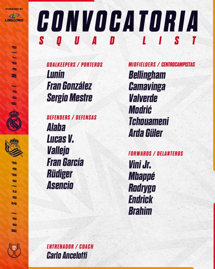 2025-03-31 21:48:12皇马国王杯大名单:库尔图瓦、塞巴略斯缺阵,姆巴佩、贝林领衔